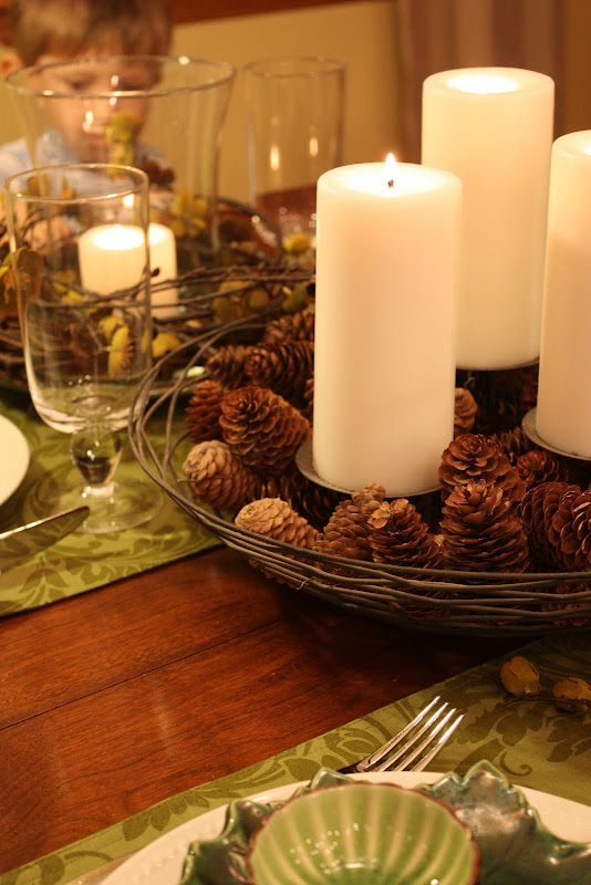 I really like how natural the center area looks will all the pinecones and candles and twig wraps. I love pinecones in general for decor--especially the scented ones!