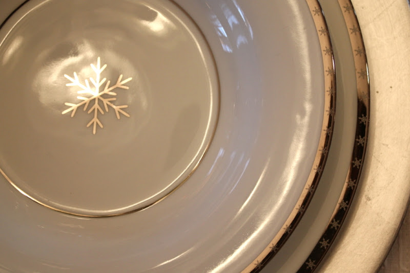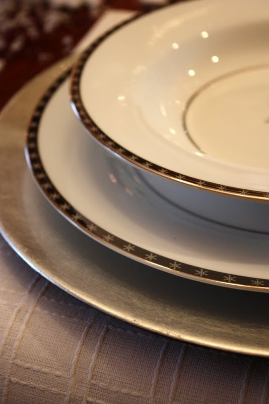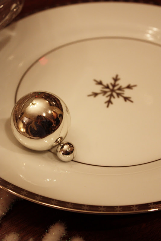 I have been really wanting to use the dishes that my dear MIL bought me as an early Christmas present and I thought this was a perfect look for them...Perfectly white with a silver band of snowflakes around the rim and a simple flake in the center