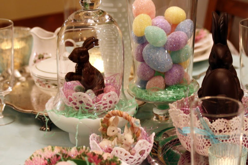 ReplyDeleteSo beautiful I love your style! The bunnies under cloches are such a great idea. I love the lace and how you put everything together. Very elegant!