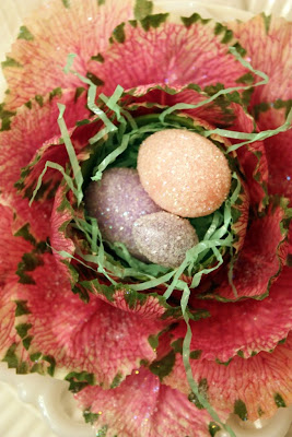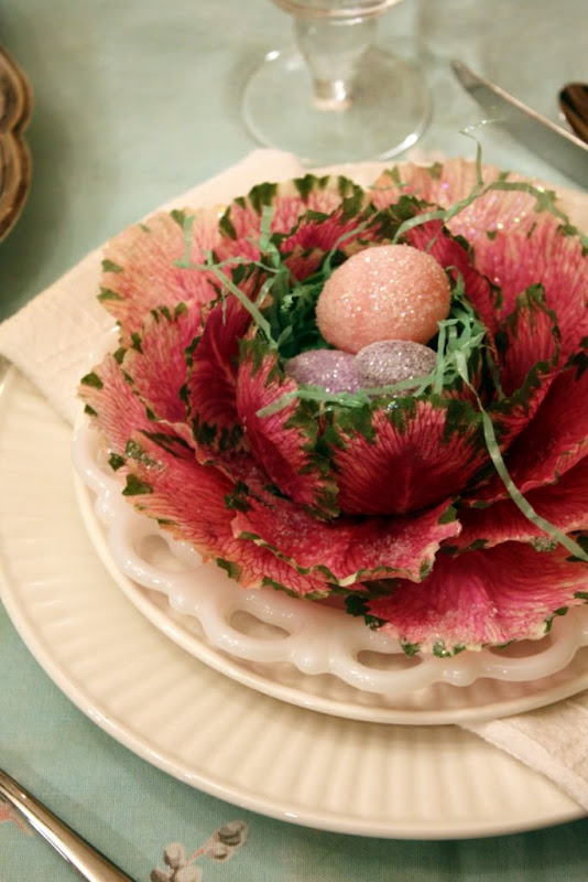 ReplyDeleteWhat a cute Easter table. Love the cabbages. The white eggs are pretty against the pink grass & aqua background. It's Easterlicious! :)