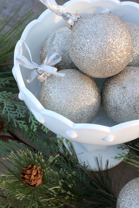 I also upcycled some glass balls and tied little silver bows on each one.
