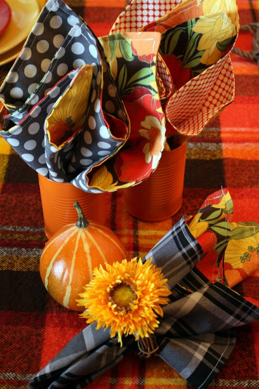 and I used tin cans spray painted orange for the flatware (they will eventually be jack-o-lanterns :)