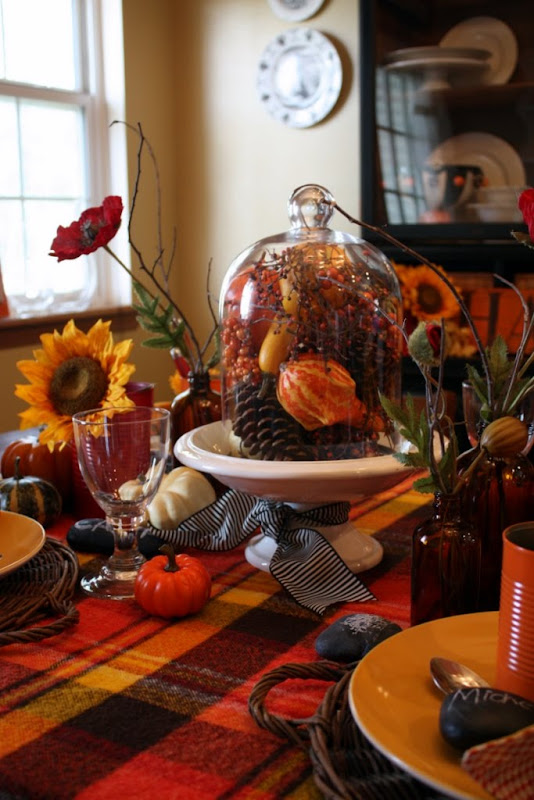 My place setting consist of wicker chargers, yellow plates, and red and orange salad plates.For every ones names, I used river rocks that I painted with Chalkboard paint, just like Pottery Barns version, much less expensive though. They really are fun, and Logan really loves them.
