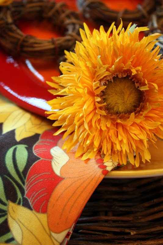 I also made the napkin rings with mini grapevine wreaths and a flower, they really tie in with the wicker chargers