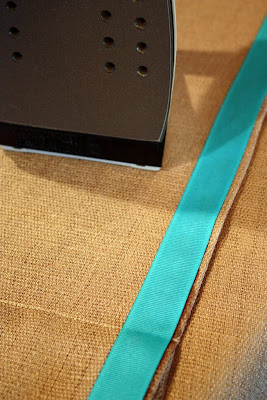 Using Heat n Bond and the same ribbon I used on the curtains, I adhered two strips of the plain ribbon side by side and a second ribbon from my stash, on top, right over the seam. I love the little white stitching on it.