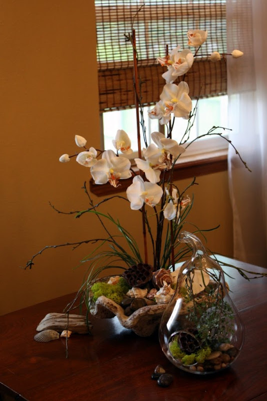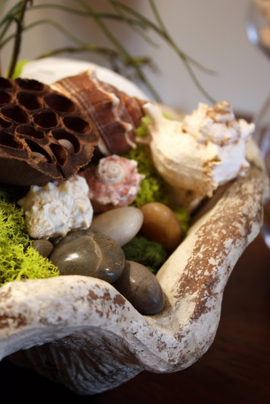 I love using grasses, twiggy twigs, rocks, shells, bamboo, moss....and that's what I selected, along with some nice looking white orchids. I decided to use a beautiful clam shell for a container